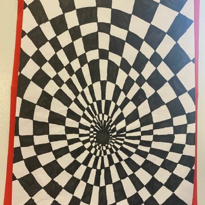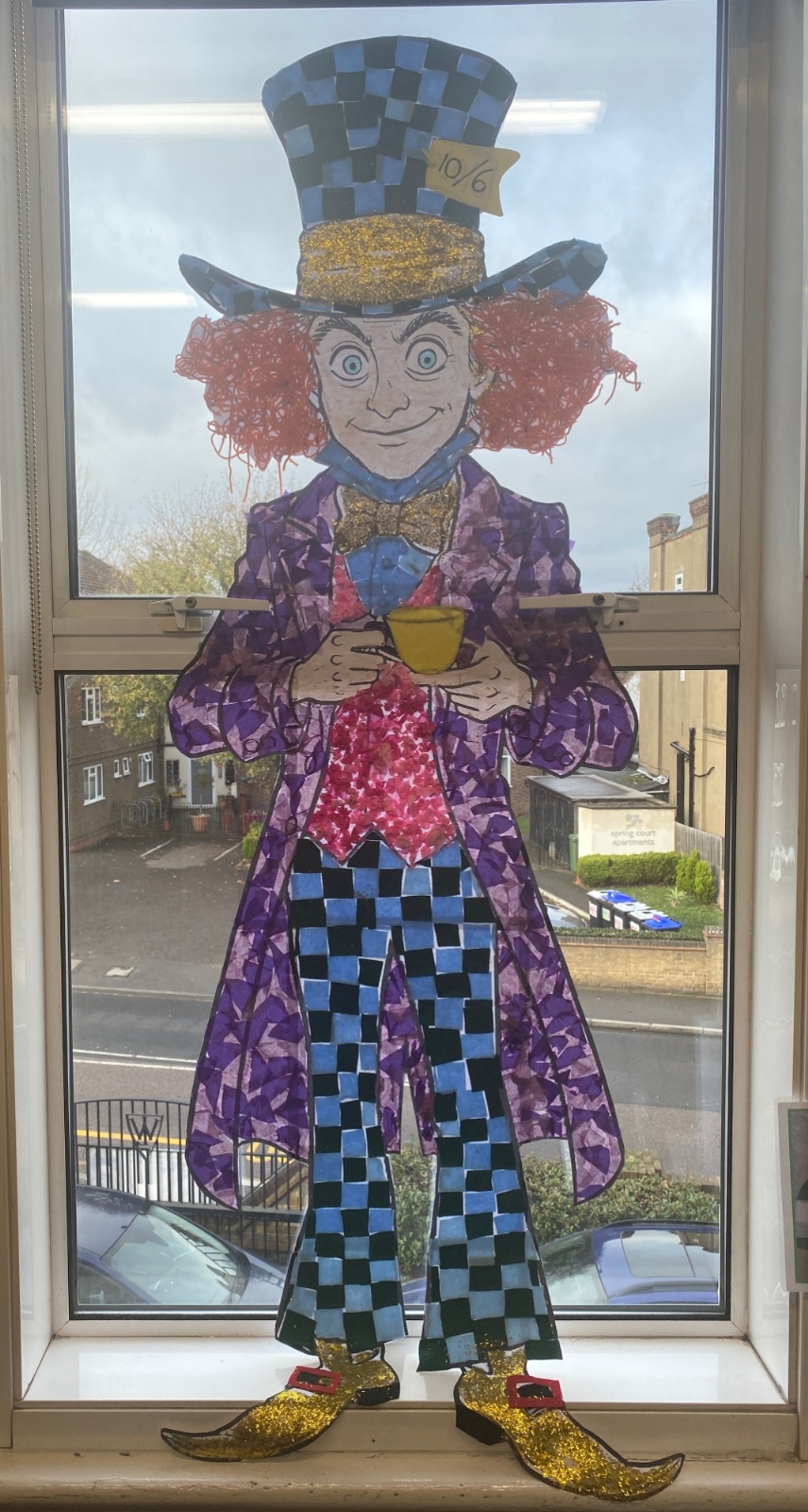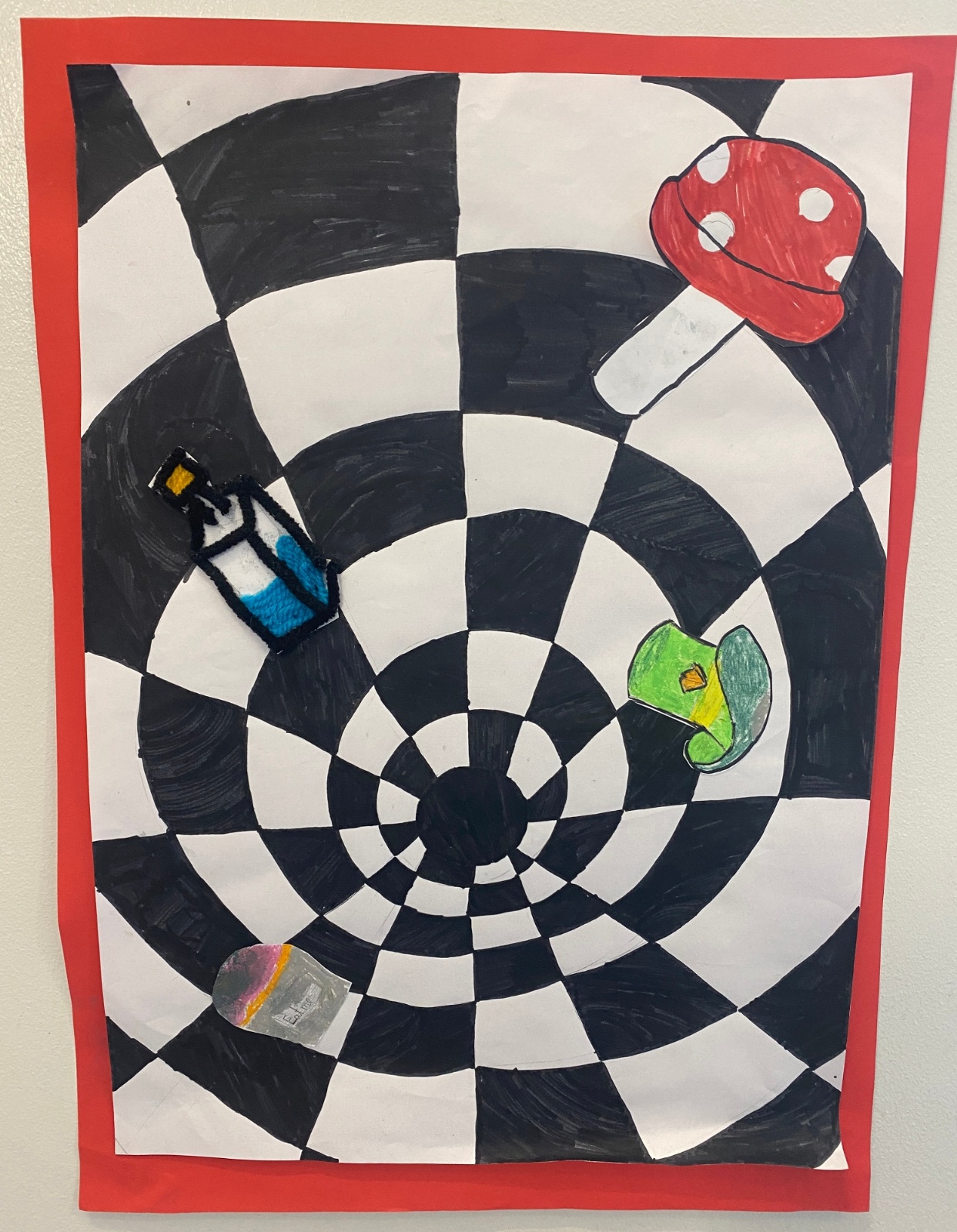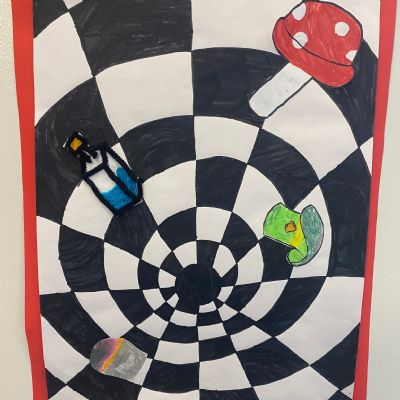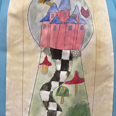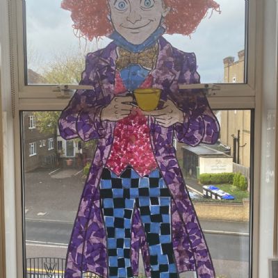 Year 1 and 2 worked together using a variety of different techniques to create these colourful potion bottles that are based on the bottle Alice discovers in the book. Year 5 explored one point perspective.