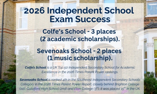 Congratulations to Year 6 pupils. Two pupils have been offered places at Sevenoaks School (1 music scholarship) and three pupils have been offered places at Colfe's School (2 academic scholarships).